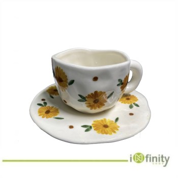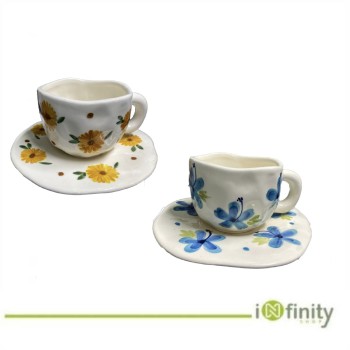 Ce produit est une tasse à café (ou à thé) avec sa soucoupe, fabriquée en céramique et décorée de motifs floraux bleus.
